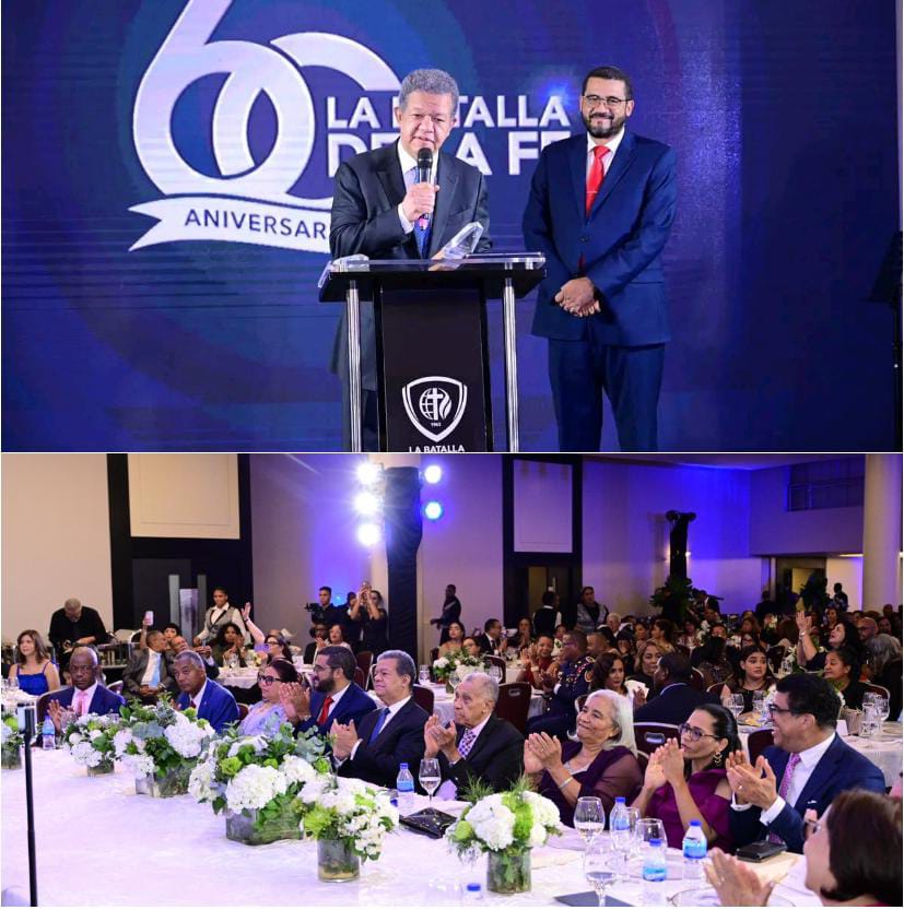 El pastor Ezequiel Molina hijo leyó una placa de reconocimiento que fue entregada a Fernández, por La Batalla de la Fe, la cual establece: “En conmemoración de nuestro 60 aniversario, agradecemos al gobierno del presidente Leonel Fernández, por su apoyo determinante a nuestra labor evangelizadora. Gracias por ayudarnos a llevar esperanza a través del evangelio”.